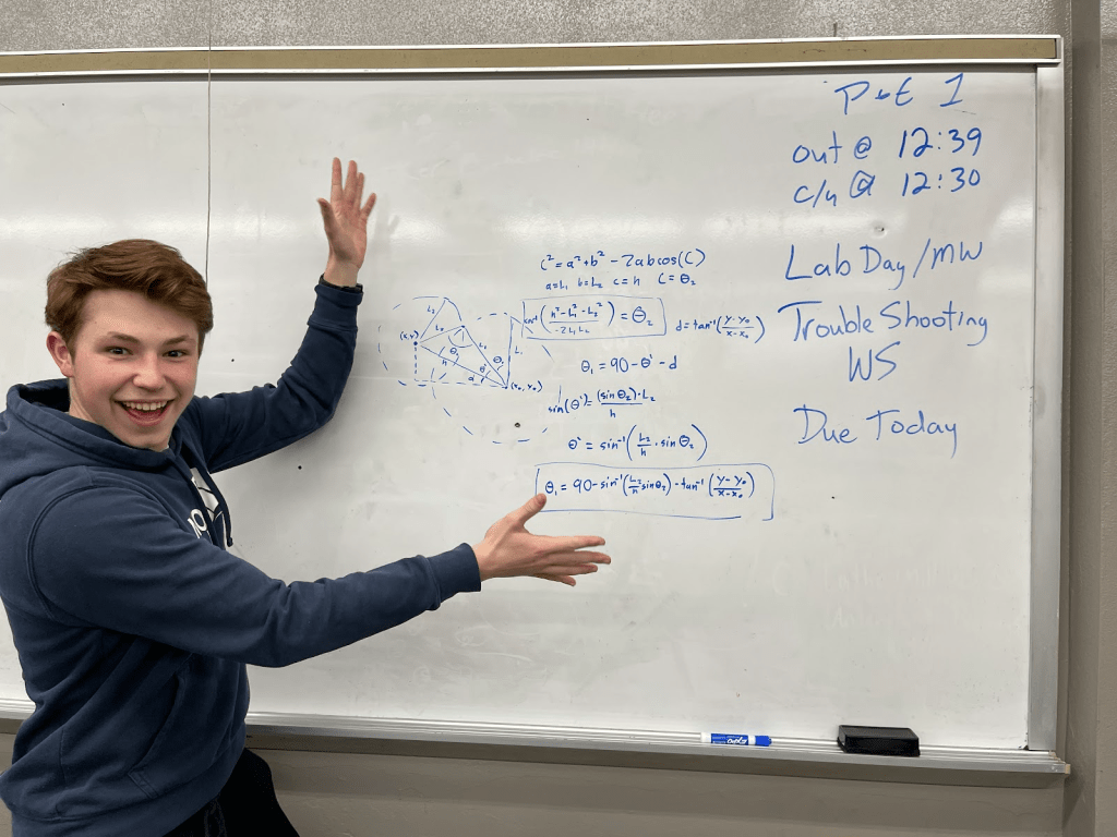 With the implementation of April Tags (or oversized QR Codes for vision systems) into the 2023 Game, our team reconfigured the robot vision system to be able to identify April Tags for autonomous alignment and positioning. We also calculated the inverse kinematics to add software stops to our code to prevent our arm mechanism from extending past the legal limit.